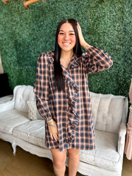 Elevate your wardrobe with this navy plaid ruffle dress, blending classic patterns with playful details. The soft fabric and flattering silhouette offer all-day comfort and style, while the delicate ruffles add a feminine touch perfect for any occasion. Make a confident statement effortlessly in this versatile dress designed to turn heads.