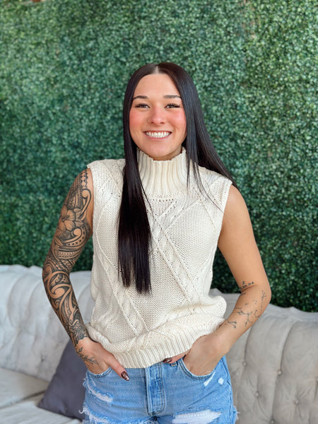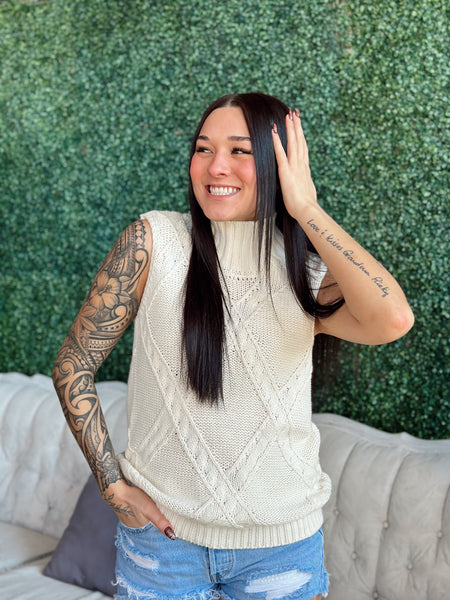 Elevate your style with this High Neck Sleeveless Cable Sweater Top, perfect for layering or wearing solo on warmer days. Its cozy cable knit hugs you just right while the sleeveless design keeps things breezy and fun. Whether paired with jeans or a skirt, it’s playful comfort that’s ready to keep you looking effortlessly chic.
