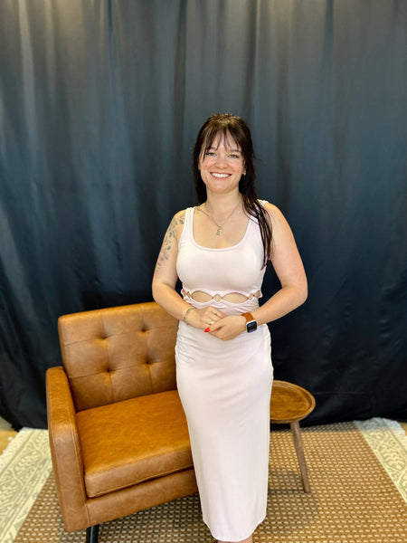 Unleash your inner risk-taker in our If You Want Forever Dress. With a sleeveless scoop neckline, bold O-ring details along the midriff, and a sultry thigh slit, this midi-length dress exudes confidence and adventure. Dare to stand out and make a statement in this stunning piece. Limited quantities available!