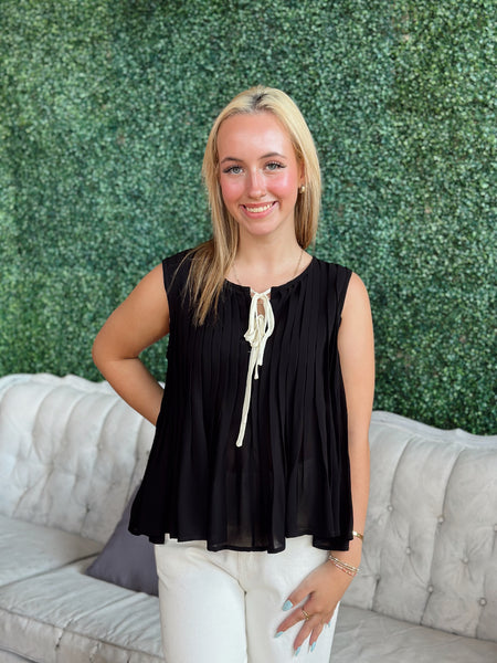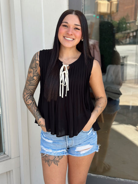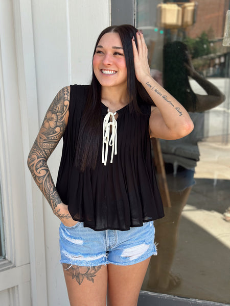 Elevate your look with the Leana Blouse in sleek black. This sleeveless top features delicate pin tuck detailing that adds texture and charm, perfect for twirling through your day with effortless style. Light and airy, it’s your go-to piece for warm weather, layering, or dressing up any outfit with a playful touch.